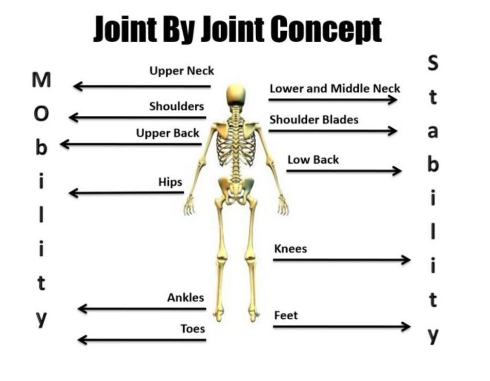 Each joint or body area has a preference or need for more mobility/flexibility or stability/strength during our day to day training. There's a pattern of alternating mobility and stability in each joint -- giving us the "Joint By Joint" approach.