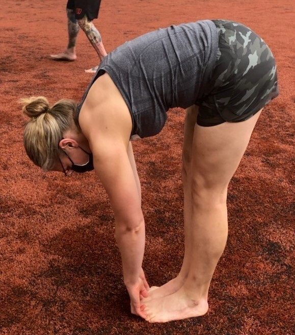 We then went through a series of mobility routines starting at our feet and working their way up the kinetic chain to our calves, hips and then core. After each drill, we re-assessed our toe touch. I was pretty disappointed at first because I didn't notice any change with the foot or calf exercises. Then I got to the FMS toe touch progression and things started to change. This drill involves putting something small in between your knees to squeeze (hard!). Then you bend over to touch your toes in two positions -- first with your toes propped up on a 2x4 and heels on the ground, then with your heels propped up on the 2x4 and your toes on the ground. This is what my toe touch looked like after this drill.